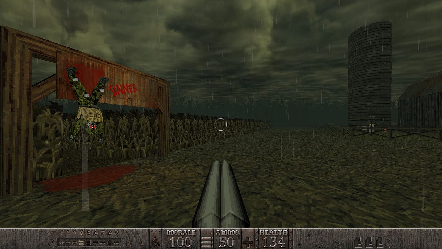 Dusk’s gameplay hits all the right notes, but that’s only a part of what makes this game special. Though boomer shooters have a reputation for paper-thin story, Dusk takes some lessons from the modern age of environmental storytelling to let the levels do the narrative work without distracting from the action. There’s clear continuity from one level to the next, and Szymanski leverages the traditional episodic structure of the classics to further establish thematic progression. The game’s first episode in the rural outskirts pits you against such enemies as hooded cultists, chainsaw-wielding leathernecks, and shotgun-toting scarecrows. Levels resemble real places like farms and lumber yards more than they did in games like Quake, and you can see evidence of how the cult’s influence has affected this place everywhere. There’s some clear slasher inspiration here but, like most boomer shooters, the horror influences don’t manifest in particularly scary moments. Everything seems cut and dry, especially to fans of the genre, but that’s exactly what Dusk wants you to think.